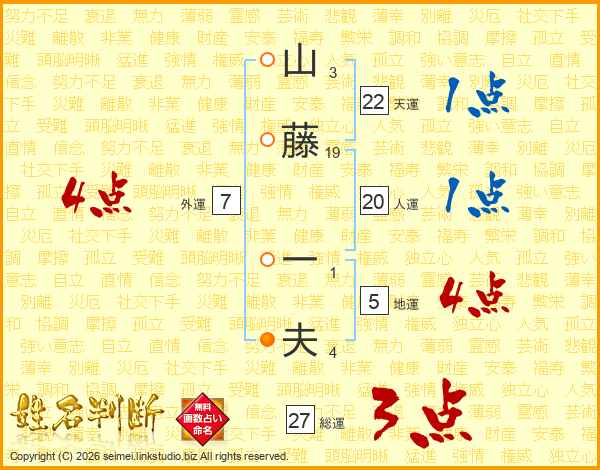 山(3画)藤(19画) 一(1画)夫(4画)