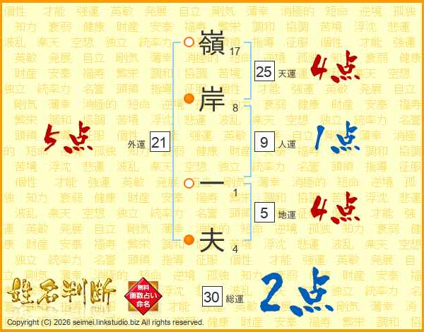 嶺(17画)岸(8画) 一(1画)夫(4画)