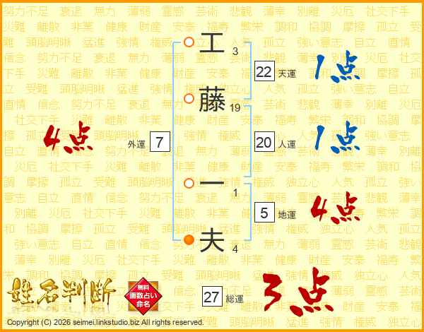 生活面を象徴する運勢です。外部から受ける影響力を表し、結婚運、家庭運や職場、環境への順応性を表します。総運から人運を引いた画数。姓や名が1文字の場合を除く。