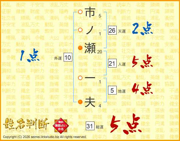 市(5画)ノ(1画)瀬(20画) 一(1画)夫(4画)