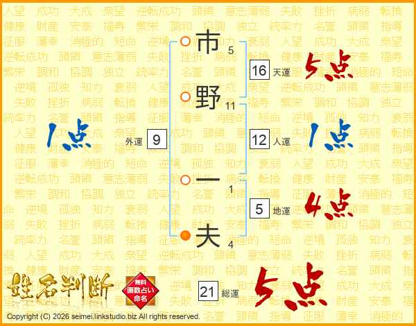 市野一夫さんの総運は21画の5点!