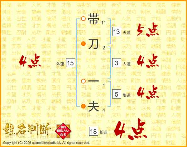 帯(11画)刀(2画) 一(1画)夫(4画)