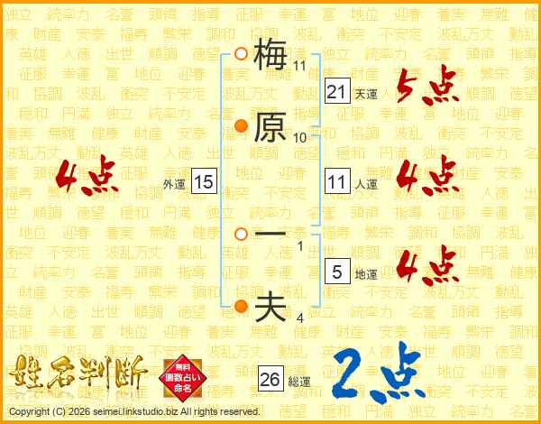 あなたの人生を表す1番重要な運勢です。生涯を通じて影響する総合運となり、主に50歳以降の晩年期に影響を及ぼします。苗字と名前の合計画数。