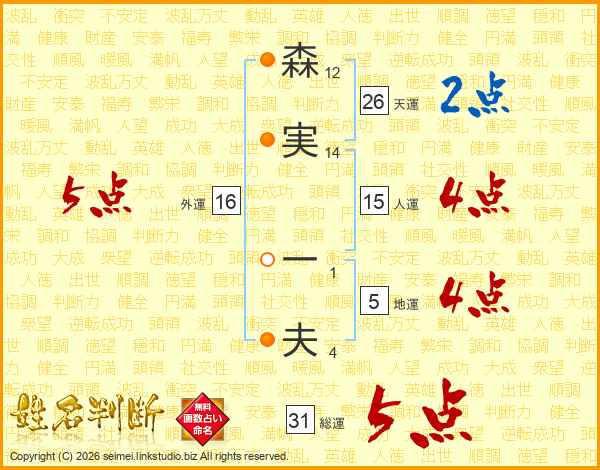 森(12画)実(14画) 一(1画)夫(4画)