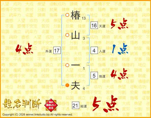 椿山一夫さんの総運は21画の5点!