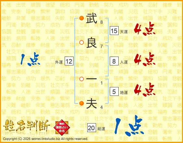 武(8画)良(7画) 一(1画)夫(4画)