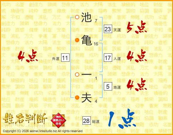 生活面を象徴する運勢です。外部から受ける影響力を表し、結婚運、家庭運や職場、環境への順応性を表します。総運から人運を引いた画数。姓や名が1文字の場合を除く。