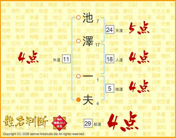 あなたの人生を表す1番重要な運勢です。生涯を通じて影響する総合運となり、主に50歳以降の晩年期に影響を及ぼします。苗字と名前の合計画数。