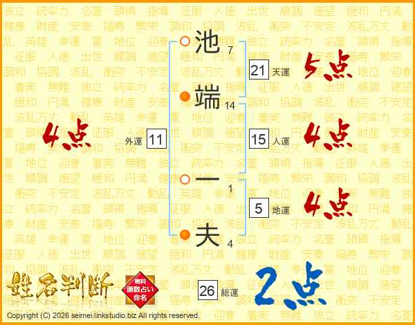 生活面を象徴する運勢です。外部から受ける影響力を表し、結婚運、家庭運や職場、環境への順応性を表します。総運から人運を引いた画数。姓や名が1文字の場合を除く。