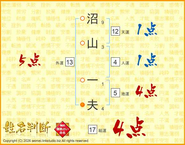 沼(9画)山(3画) 一(1画)夫(4画)