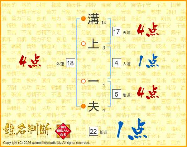 生活面を象徴する運勢です。外部から受ける影響力を表し、結婚運、家庭運や職場、環境への順応性を表します。総運から人運を引いた画数。姓や名が1文字の場合を除く。