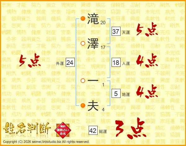 滝(20画)澤(17画) 一(1画)夫(4画)