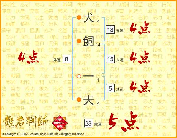 犬(4画)飼(14画) 一(1画)夫(4画)