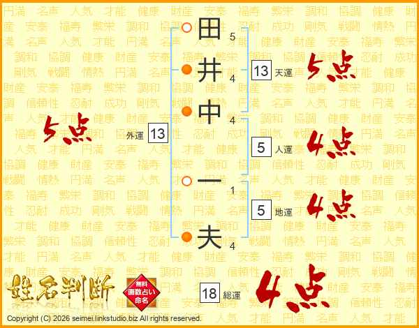 田(5画)井(4画)中(4画) 一(1画)夫(4画)