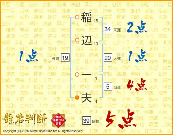 稲(15画)辺(19画) 一(1画)夫(4画)