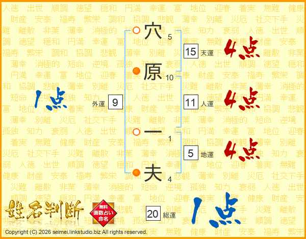 生活面を象徴する運勢です。外部から受ける影響力を表し、結婚運、家庭運や職場、環境への順応性を表します。総運から人運を引いた画数。姓や名が1文字の場合を除く。
