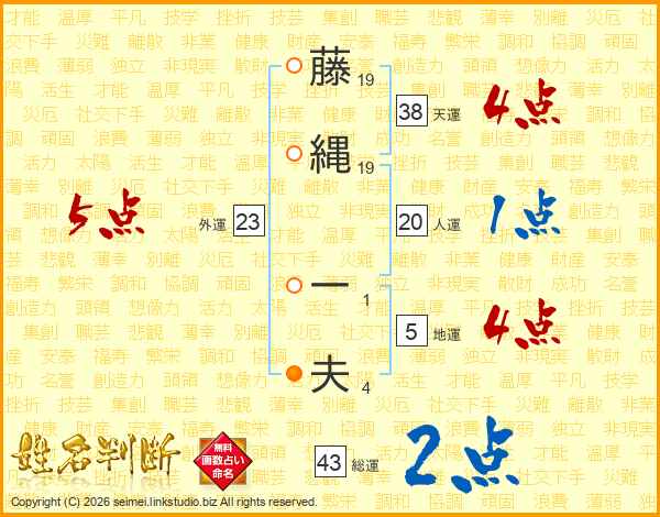 藤(19画)縄(19画) 一(1画)夫(4画)