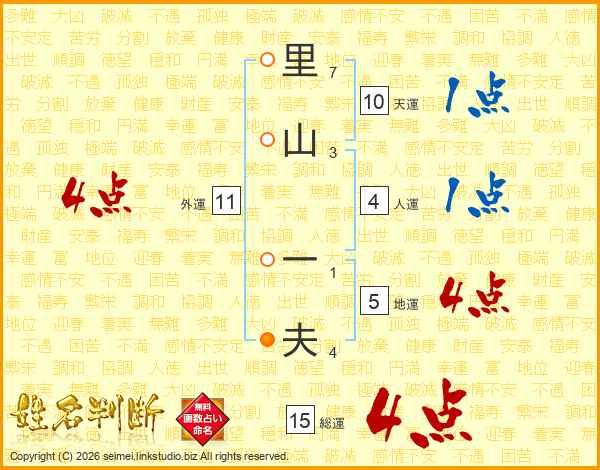 生活面を象徴する運勢です。外部から受ける影響力を表し、結婚運、家庭運や職場、環境への順応性を表します。総運から人運を引いた画数。姓や名が1文字の場合を除く。