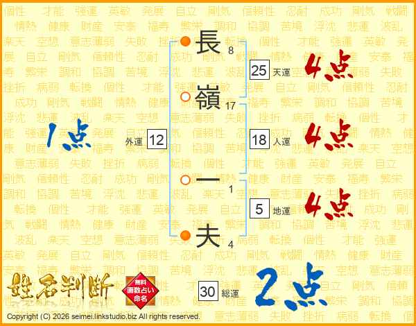 長(8画)嶺(17画) 一(1画)夫(4画)
