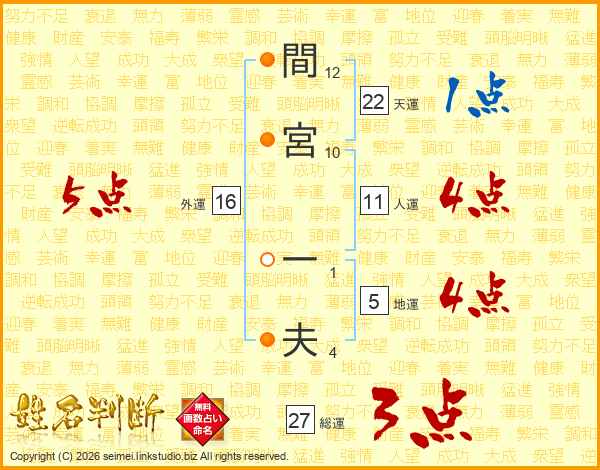 生活面を象徴する運勢です。外部から受ける影響力を表し、結婚運、家庭運や職場、環境への順応性を表します。総運から人運を引いた画数。姓や名が1文字の場合を除く。