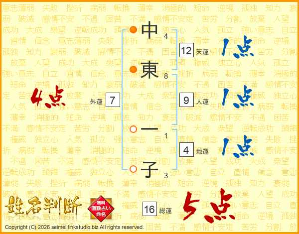 中(4画)東(8画) 一(1画)子(3画)