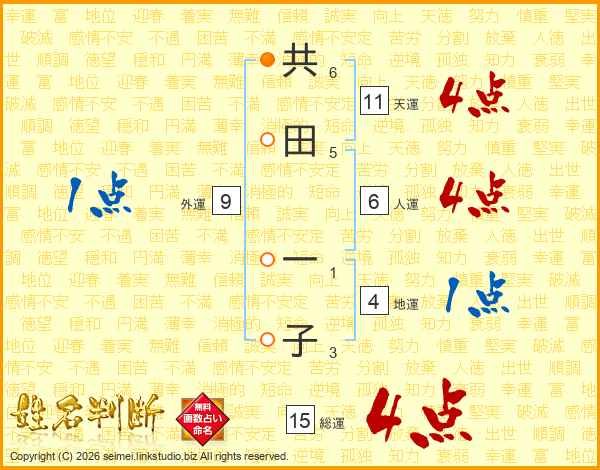 生活面を象徴する運勢です。外部から受ける影響力を表し、結婚運、家庭運や職場、環境への順応性を表します。総運から人運を引いた画数。姓や名が1文字の場合を除く。