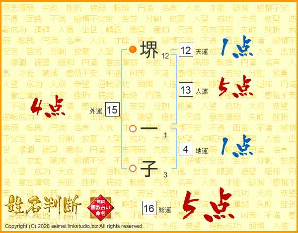 生活面を象徴する運勢です。外部から受ける影響力を表し、結婚運、家庭運や職場、環境への順応性を表します。総運から人運を引いた画数。姓や名が1文字の場合を除く。
