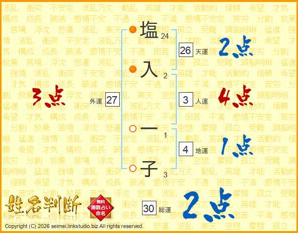 生活面を象徴する運勢です。外部から受ける影響力を表し、結婚運、家庭運や職場、環境への順応性を表します。総運から人運を引いた画数。姓や名が1文字の場合を除く。