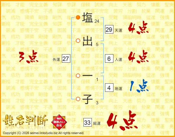 塩(24画)出(5画) 一(1画)子(3画)