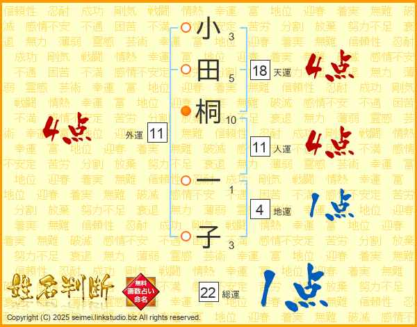 小(3画)田(5画)桐(10画) 一(1画)子(3画)