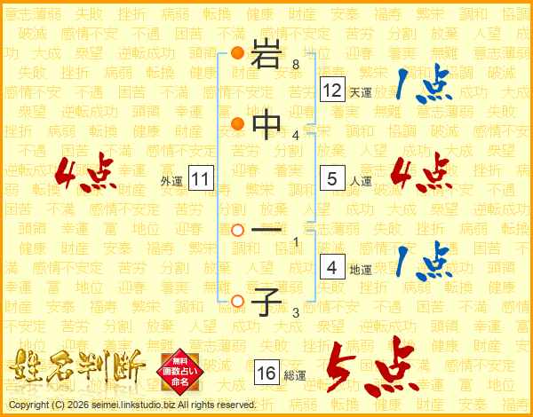 あなたの人生を表す1番重要な運勢です。生涯を通じて影響する総合運となり、主に50歳以降の晩年期に影響を及ぼします。苗字と名前の合計画数。