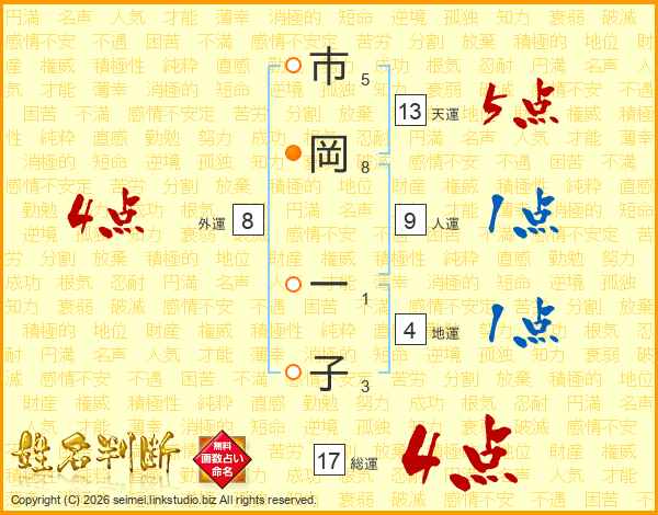 生活面を象徴する運勢です。外部から受ける影響力を表し、結婚運、家庭運や職場、環境への順応性を表します。総運から人運を引いた画数。姓や名が1文字の場合を除く。