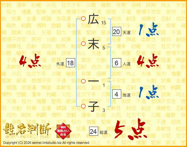 生活面を象徴する運勢です。外部から受ける影響力を表し、結婚運、家庭運や職場、環境への順応性を表します。総運から人運を引いた画数。姓や名が1文字の場合を除く。
