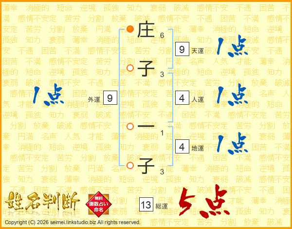 生活面を象徴する運勢です。外部から受ける影響力を表し、結婚運、家庭運や職場、環境への順応性を表します。総運から人運を引いた画数。姓や名が1文字の場合を除く。