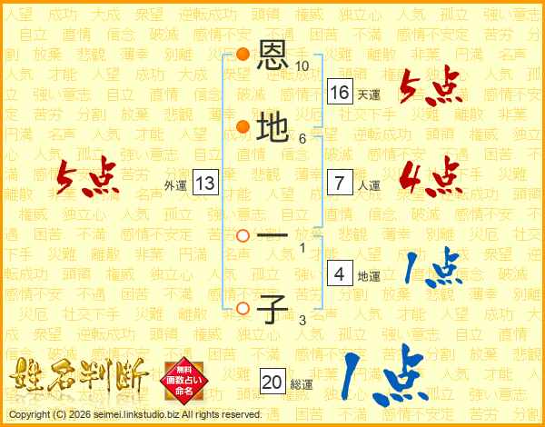 生活面を象徴する運勢です。外部から受ける影響力を表し、結婚運、家庭運や職場、環境への順応性を表します。総運から人運を引いた画数。姓や名が1文字の場合を除く。