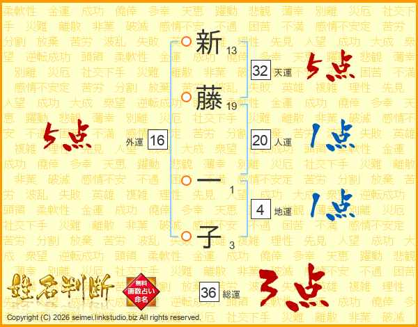 あなたの人生を表す1番重要な運勢です。生涯を通じて影響する総合運となり、主に50歳以降の晩年期に影響を及ぼします。苗字と名前の合計画数。