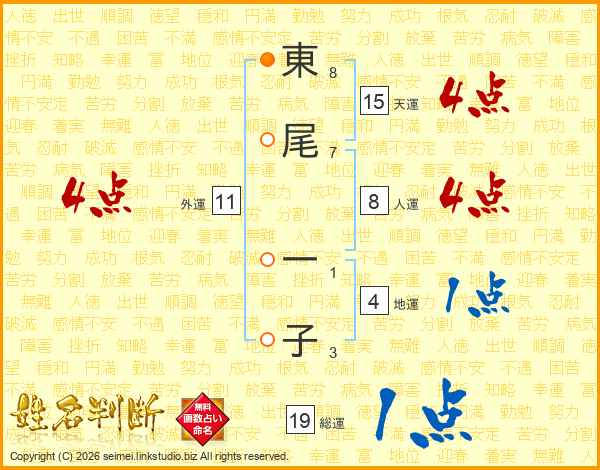 生活面を象徴する運勢です。外部から受ける影響力を表し、結婚運、家庭運や職場、環境への順応性を表します。総運から人運を引いた画数。姓や名が1文字の場合を除く。