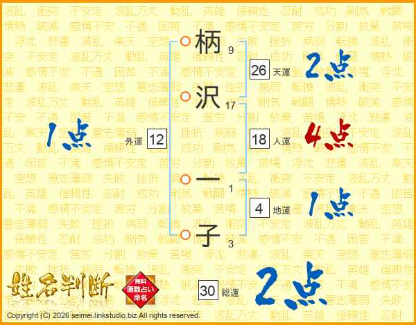 生活面を象徴する運勢です。外部から受ける影響力を表し、結婚運、家庭運や職場、環境への順応性を表します。総運から人運を引いた画数。姓や名が1文字の場合を除く。