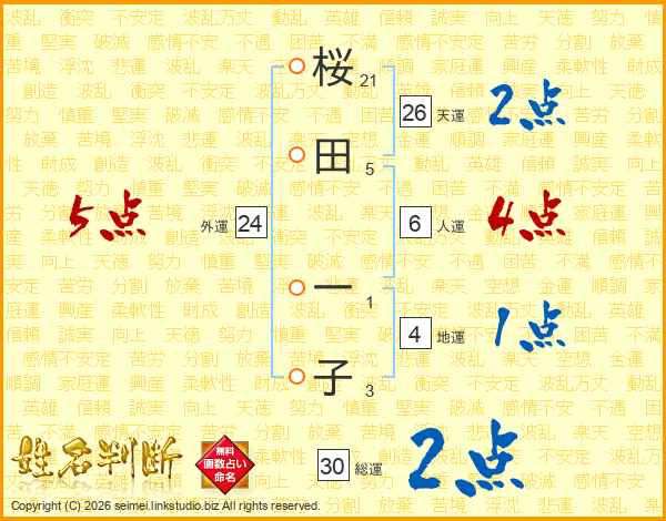 あなたの人生を表す1番重要な運勢です。生涯を通じて影響する総合運となり、主に50歳以降の晩年期に影響を及ぼします。苗字と名前の合計画数。