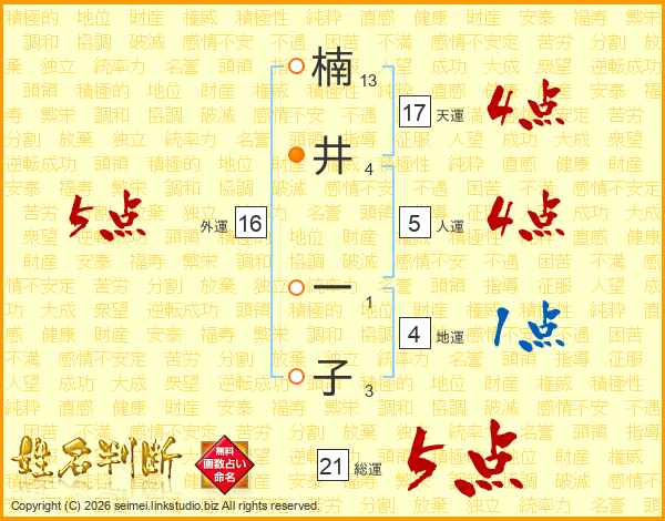 生活面を象徴する運勢です。外部から受ける影響力を表し、結婚運、家庭運や職場、環境への順応性を表します。総運から人運を引いた画数。姓や名が1文字の場合を除く。