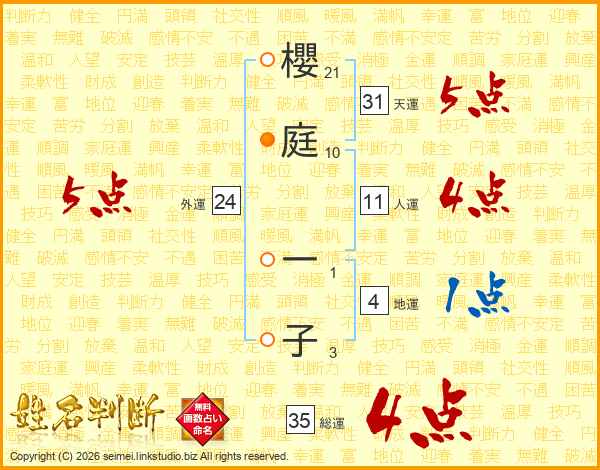 櫻(21画)庭(10画) 一(1画)子(3画)