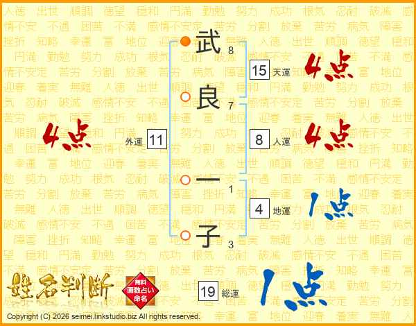 生活面を象徴する運勢です。外部から受ける影響力を表し、結婚運、家庭運や職場、環境への順応性を表します。総運から人運を引いた画数。姓や名が1文字の場合を除く。