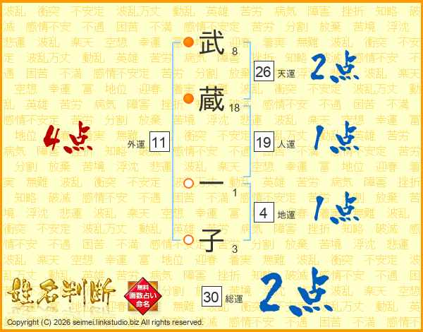 武(8画)蔵(18画) 一(1画)子(3画)
