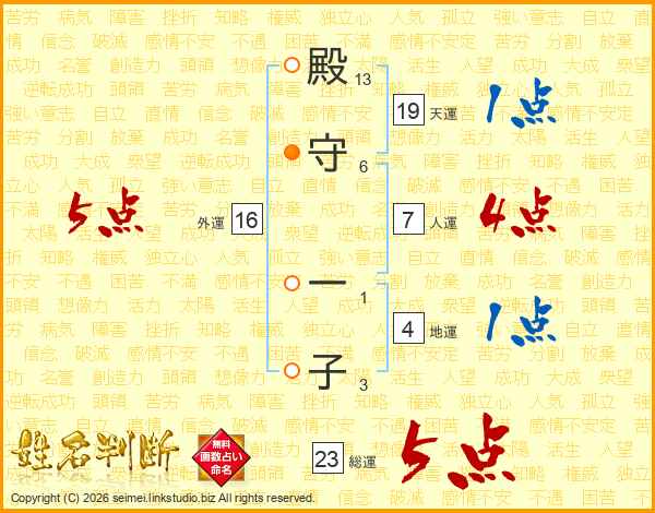 生活面を象徴する運勢です。外部から受ける影響力を表し、結婚運、家庭運や職場、環境への順応性を表します。総運から人運を引いた画数。姓や名が1文字の場合を除く。
