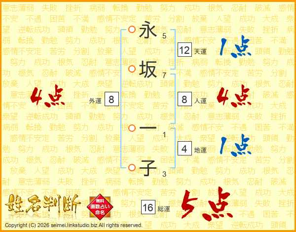 生活面を象徴する運勢です。外部から受ける影響力を表し、結婚運、家庭運や職場、環境への順応性を表します。総運から人運を引いた画数。姓や名が1文字の場合を除く。