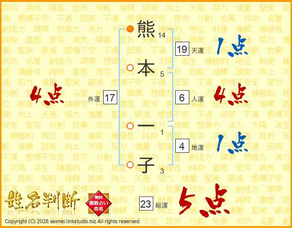 あなたの人生を表す1番重要な運勢です。生涯を通じて影響する総合運となり、主に50歳以降の晩年期に影響を及ぼします。苗字と名前の合計画数。