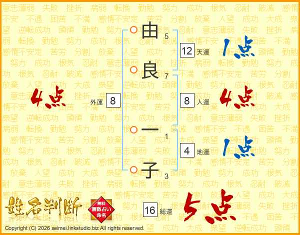 由(5画)良(7画) 一(1画)子(3画)
