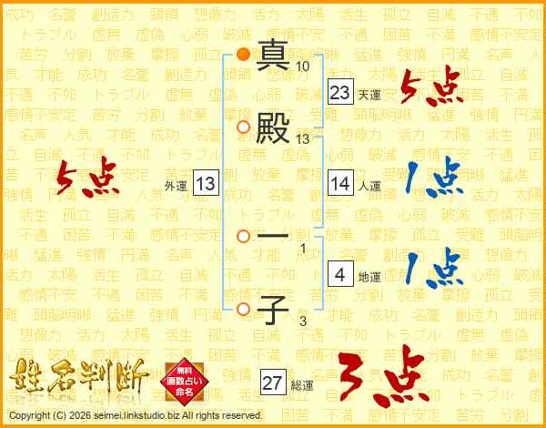 生活面を象徴する運勢です。外部から受ける影響力を表し、結婚運、家庭運や職場、環境への順応性を表します。総運から人運を引いた画数。姓や名が1文字の場合を除く。