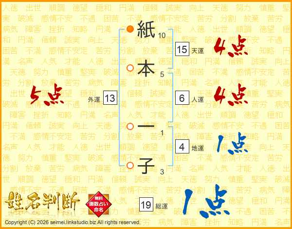 あなたの人生を表す1番重要な運勢です。生涯を通じて影響する総合運となり、主に50歳以降の晩年期に影響を及ぼします。苗字と名前の合計画数。
