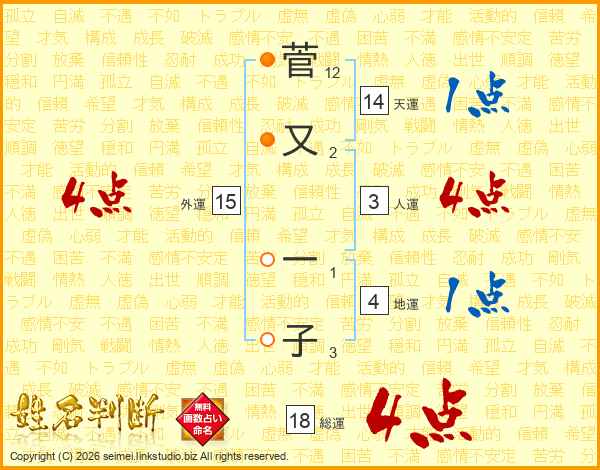 生活面を象徴する運勢です。外部から受ける影響力を表し、結婚運、家庭運や職場、環境への順応性を表します。総運から人運を引いた画数。姓や名が1文字の場合を除く。